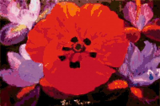Ориентировочно так, схема вышивки «Poppy», созданная автором lukrecija12, будет выглядеть при отшиве на канве. Размер данной вышивки равен 190x126 крестов, при этом используется 35 цветов. Ключевые слова, по которым можно найти эту схему: flower. Также, вы можете взглянуть на оригинальную картинку, соответствующую данной схеме вышивки.