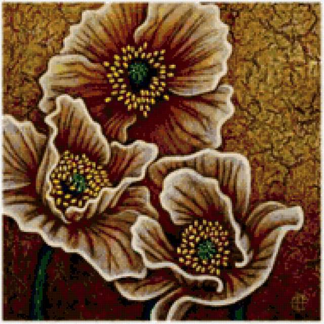 Ориентировочно так, схема вышивки «Poppy», созданная автором aniela, будет выглядеть при отшиве на канве. Размер данной вышивки равен 190x190 крестов, при этом используется 70 цветов. Ключевые слова, по которым можно найти эту схему: цветы, flowers. Также, вы можете взглянуть на оригинальную картинку, соответствующую данной схеме вышивки.