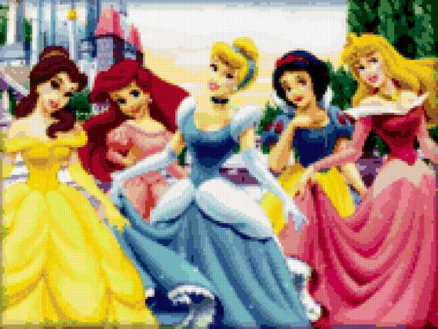 Ориентировочно так, схема вышивки «Princess», созданная автором sweetpumpkin, будет выглядеть при отшиве на канве. Размер данной вышивки равен 190x143 крестов, при этом используется 67 цветов. Ключевые слова, по которым можно найти эту схему: disney. Также, вы можете взглянуть на оригинальную картинку, соответствующую данной схеме вышивки.