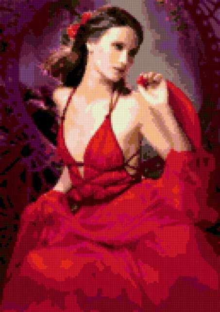 Ориентировочно так, схема вышивки «Princessa», созданная автором lukrecija12, будет выглядеть при отшиве на канве. Размер данной вышивки равен 129x182 крестов, при этом используется 41 цветов. Ключевые слова, по которым можно найти эту схему: zenshina. Также, вы можете взглянуть на оригинальную картинку, соответствующую данной схеме вышивки.