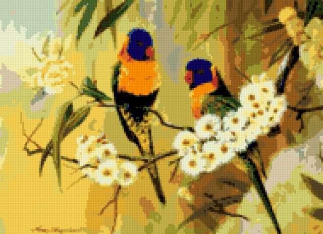 Ориентировочно так, схема вышивки «Ptichki», созданная автором lukrecija12, будет выглядеть при отшиве на канве. Размер данной вышивки равен 190x138 крестов, при этом используется 33 цветов. Ключевые слова, по которым можно найти эту схему: pticy. Также, вы можете взглянуть на оригинальную картинку, соответствующую данной схеме вышивки.