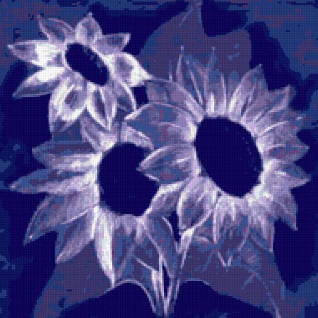Ориентировочно так, схема вышивки «Purple Sunflowers», созданная автором pandreevska, будет выглядеть при отшиве на канве. Размер данной вышивки равен 190x190 крестов, при этом используется 20 цветов. Ключевые слова, по которым можно найти эту схему: flower, abstract, purple, decoration. Также, вы можете взглянуть на оригинальную картинку, соответствующую данной схеме вышивки.