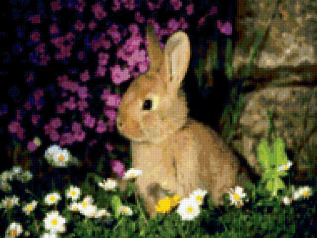 Ориентировочно так, схема вышивки «Rabbit», созданная автором irserd, будет выглядеть при отшиве на канве. Размер данной вышивки равен 190x143 крестов, при этом используется 68 цветов. Ключевые слова, по которым можно найти эту схему: кролик. Также, вы можете взглянуть на оригинальную картинку, соответствующую данной схеме вышивки.