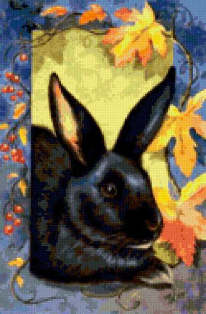Ориентировочно так, схема вышивки «Rabbit», созданная автором aniela, будет выглядеть при отшиве на канве. Размер данной вышивки равен 125x190 крестов, при этом используется 77 цветов. Ключевые слова, по которым можно найти эту схему: wildlife, animals, животные. Также, вы можете взглянуть на оригинальную картинку, соответствующую данной схеме вышивки.