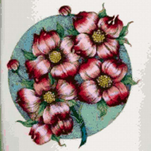 Ориентировочно так, схема вышивки «Red Flowers», созданная автором pandreevska, будет выглядеть при отшиве на канве. Размер данной вышивки равен 190x190 крестов, при этом используется 46 цветов. Ключевые слова, по которым можно найти эту схему: flower, decoration, bright. Также, вы можете взглянуть на оригинальную картинку, соответствующую данной схеме вышивки.