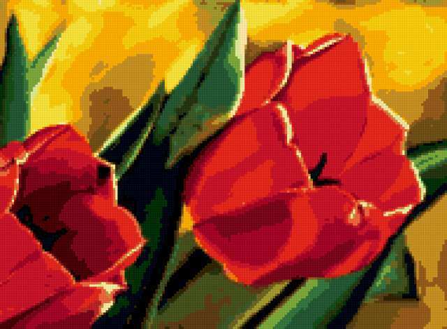 Ориентировочно так, схема вышивки «Red tulips», созданная автором lukrecija12, будет выглядеть при отшиве на канве. Размер данной вышивки равен 190x140 крестов, при этом используется 33 цветов. Ключевые слова, по которым можно найти эту схему: flower. Также, вы можете взглянуть на оригинальную картинку, соответствующую данной схеме вышивки.