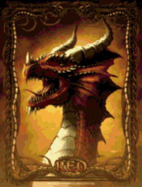 Ориентировочно так, схема вышивки «Red», созданная автором avevstigneeva, будет выглядеть при отшиве на канве. Размер данной вышивки равен 145x190 крестов, при этом используется 52 цветов. Ключевые слова, по которым можно найти эту схему: дракон. Также, вы можете взглянуть на оригинальную картинку, соответствующую данной схеме вышивки.