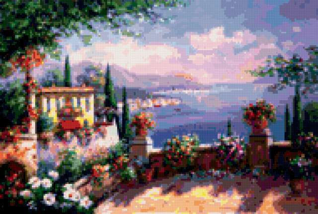 Ориентировочно так, схема вышивки «Rene Biegler», созданная автором malkinaiv, будет выглядеть при отшиве на канве. Размер данной вышивки равен 190x128 крестов, при этом используется 68 цветов. Ключевые слова, по которым можно найти эту схему: картина, набережная, пейзаж, цветы, море, дома. Также, вы можете взглянуть на оригинальную картинку, соответствующую данной схеме вышивки.