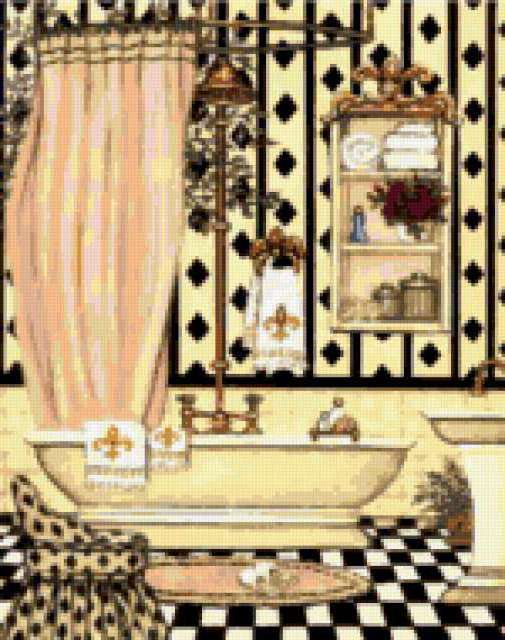 Ориентировочно так, схема вышивки «Retro Bathroom», созданная автором pandreevska, будет выглядеть при отшиве на канве. Размер данной вышивки равен 150x190 крестов, при этом используется 52 цветов. Ключевые слова, по которым можно найти эту схему: bath, retro, interior, elegant. Также, вы можете взглянуть на оригинальную картинку, соответствующую данной схеме вышивки.