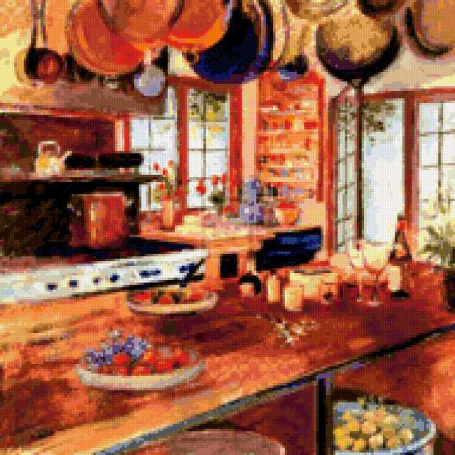 Ориентировочно так, схема вышивки «Retro Kitchen», созданная автором pandreevska, будет выглядеть при отшиве на канве. Размер данной вышивки равен 190x190 крестов, при этом используется 80 цветов. Ключевые слова, по которым можно найти эту схему: kitchen decoration, interior, retro. Также, вы можете взглянуть на оригинальную картинку, соответствующую данной схеме вышивки.