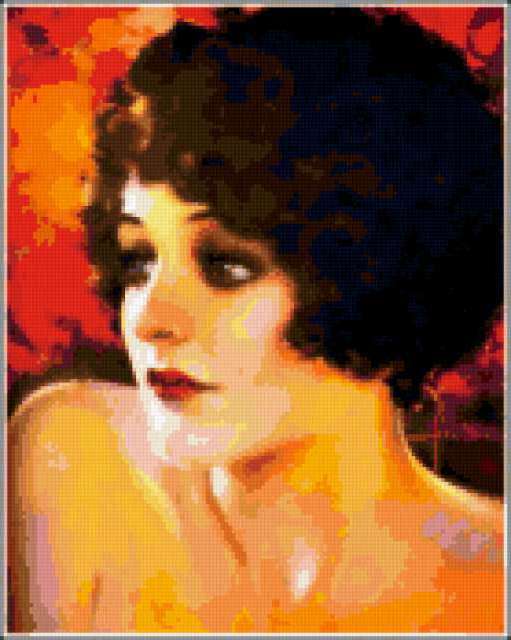 Ориентировочно так, схема вышивки «Retro portret», созданная автором lukrecija12, будет выглядеть при отшиве на канве. Размер данной вышивки равен 139x174 крестов, при этом используется 53 цветов. Ключевые слова, по которым можно найти эту схему: zenshina, portret. Также, вы можете взглянуть на оригинальную картинку, соответствующую данной схеме вышивки.