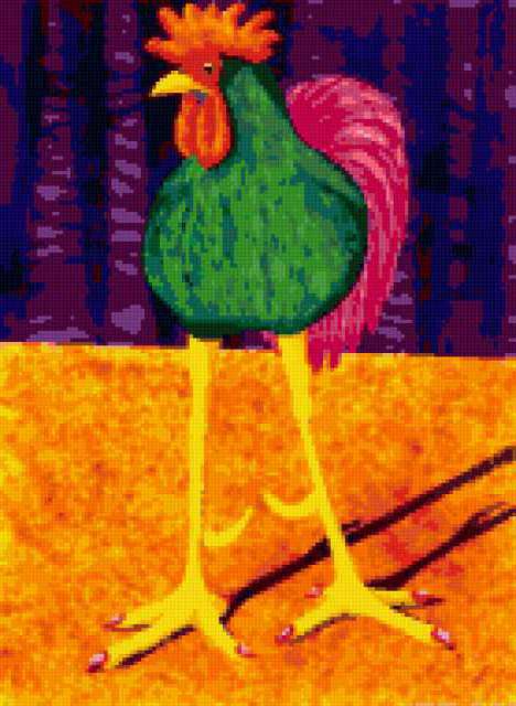 Ориентировочно так, схема вышивки «Rooster», созданная автором pandreevska, будет выглядеть при отшиве на канве. Размер данной вышивки равен 139x190 крестов, при этом используется 39 цветов. Ключевые слова, по которым можно найти эту схему: rooster, village, colorful, bright. Также, вы можете взглянуть на оригинальную картинку, соответствующую данной схеме вышивки.