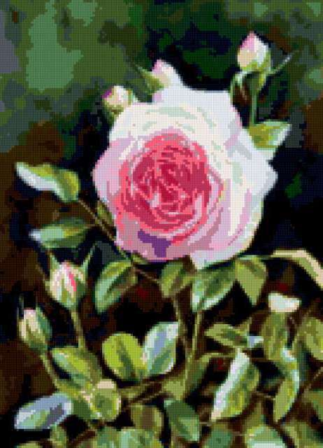 Ориентировочно так, схема вышивки «Rose», созданная автором lukrecija12, будет выглядеть при отшиве на канве. Размер данной вышивки равен 136x188 крестов, при этом используется 39 цветов. Ключевые слова, по которым можно найти эту схему: cvety, roza. Также, вы можете взглянуть на оригинальную картинку, соответствующую данной схеме вышивки.