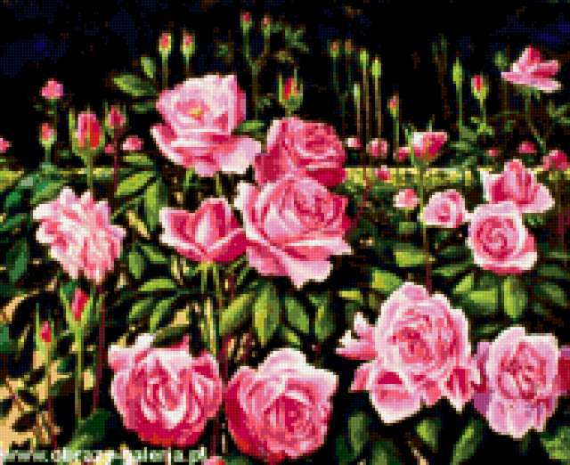Ориентировочно так, схема вышивки «Roses», созданная автором aniela, будет выглядеть при отшиве на канве. Размер данной вышивки равен 190x155 крестов, при этом используется 72 цветов. Ключевые слова, по которым можно найти эту схему: цветы, flowers. Также, вы можете взглянуть на оригинальную картинку, соответствующую данной схеме вышивки.