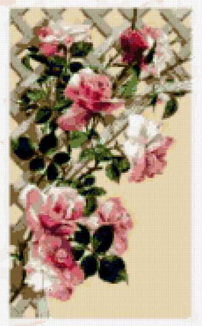 Ориентировочно так, схема вышивки «Roses», созданная автором lukrecija12, будет выглядеть при отшиве на канве. Размер данной вышивки равен 115x185 крестов, при этом используется 40 цветов. Ключевые слова, по которым можно найти эту схему: cvety. Также, вы можете взглянуть на оригинальную картинку, соответствующую данной схеме вышивки.