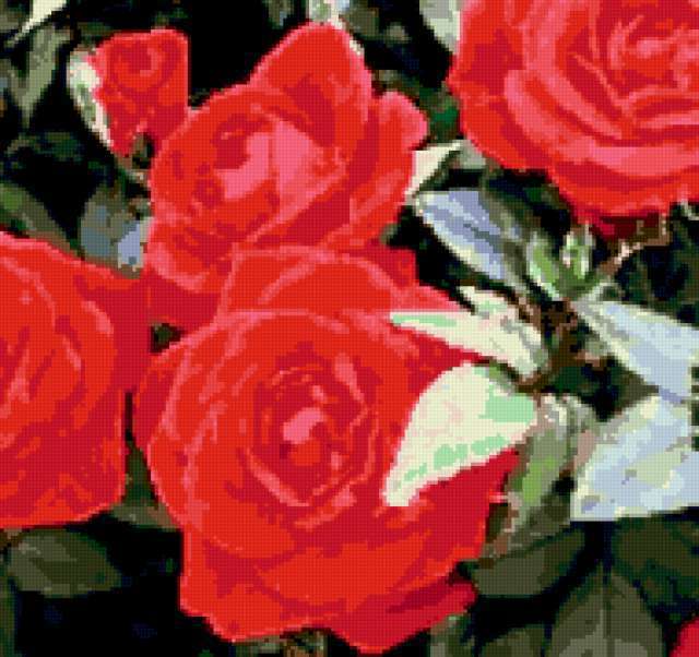 Ориентировочно так, схема вышивки «Roses», созданная автором lukrecija12, будет выглядеть при отшиве на канве. Размер данной вышивки равен 190x179 крестов, при этом используется 33 цветов. Ключевые слова, по которым можно найти эту схему: cvety, roza. Также, вы можете взглянуть на оригинальную картинку, соответствующую данной схеме вышивки.