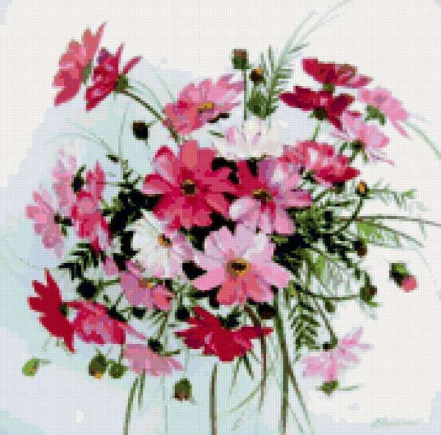 Ориентировочно так, схема вышивки «S liuboviu...», созданная автором lukrecija12, будет выглядеть при отшиве на канве. Размер данной вышивки равен 179x177 крестов, при этом используется 56 цветов. Ключевые слова, по которым можно найти эту схему: cvety. Также, вы можете взглянуть на оригинальную картинку, соответствующую данной схеме вышивки.