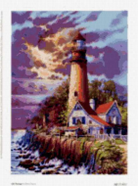 Ориентировочно так, схема вышивки «Seascape», созданная автором aniela, будет выглядеть при отшиве на канве. Размер данной вышивки равен 141x190 крестов, при этом используется 74 цветов. Ключевые слова, по которым можно найти эту схему: seascape, lighthouse, маяк. Также, вы можете взглянуть на оригинальную картинку, соответствующую данной схеме вышивки.
