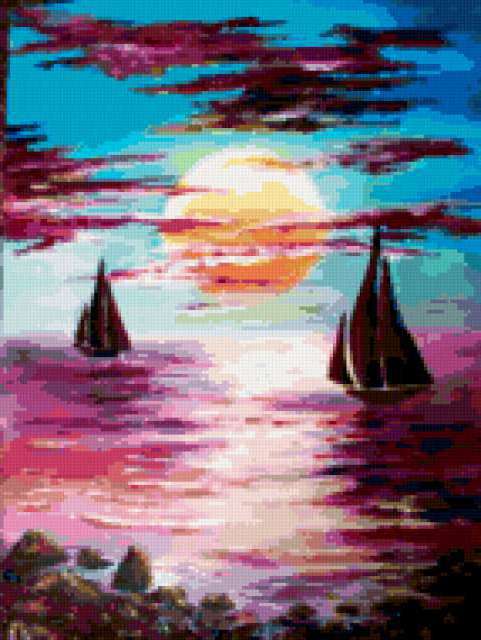Ориентировочно так, схема вышивки «Seascape», созданная автором aniela, будет выглядеть при отшиве на канве. Размер данной вышивки равен 143x190 крестов, при этом используется 82 цветов. Ключевые слова, по которым можно найти эту схему: seascape, пейзаж, boats, парусник. Также, вы можете взглянуть на оригинальную картинку, соответствующую данной схеме вышивки.