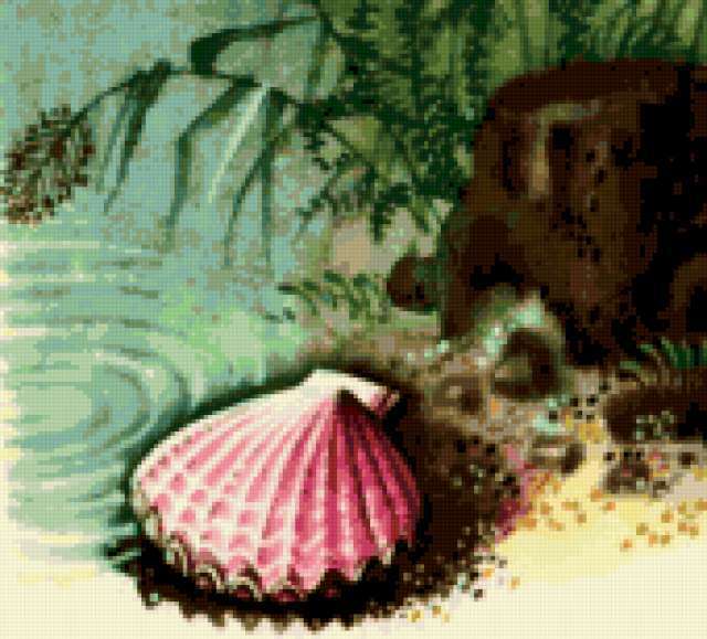 Ориентировочно так, схема вышивки «Seashell», созданная автором Cherry_LudOk, будет выглядеть при отшиве на канве. Размер данной вышивки равен 170x154 крестов, при этом используется 70 цветов. Ключевые слова, по которым можно найти эту схему: ракушка. Также, вы можете взглянуть на оригинальную картинку, соответствующую данной схеме вышивки.