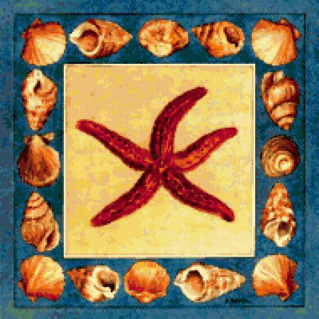 Ориентировочно так, схема вышивки «Shells Decoration», созданная автором pandreevska, будет выглядеть при отшиве на канве. Размер данной вышивки равен 190x190 крестов, при этом используется 45 цветов. Ключевые слова, по которым можно найти эту схему: shell, collage, decoration. Также, вы можете взглянуть на оригинальную картинку, соответствующую данной схеме вышивки.