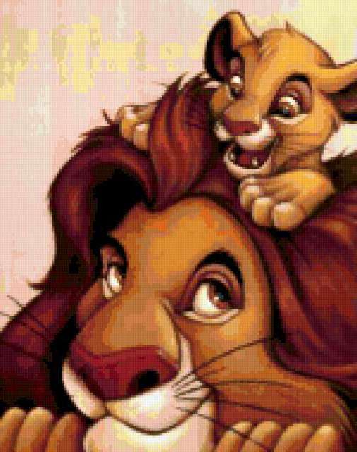 Ориентировочно так, схема вышивки «Simba», созданная автором aniela, будет выглядеть при отшиве на канве. Размер данной вышивки равен 150x190 крестов, при этом используется 64 цветов. Ключевые слова, по которым можно найти эту схему: cartoon, сказка, disney. Также, вы можете взглянуть на оригинальную картинку, соответствующую данной схеме вышивки.