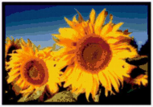 Ориентировочно так, схема вышивки «Slunecnice», созданная автором evijan, будет выглядеть при отшиве на канве. Размер данной вышивки равен 190x133 крестов, при этом используется 42 цветов. Ключевые слова, по которым можно найти эту схему: flowers. Также, вы можете взглянуть на оригинальную картинку, соответствующую данной схеме вышивки.