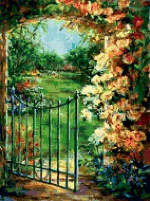 Ориентировочно так, схема вышивки «Spring Abundance», созданная автором pandreevska, будет выглядеть при отшиве на канве. Размер данной вышивки равен 142x190 крестов, при этом используется 64 цветов. Ключевые слова, по которым можно найти эту схему: garden, flowers, nature, seasons. Также, вы можете взглянуть на оригинальную картинку, соответствующую данной схеме вышивки.