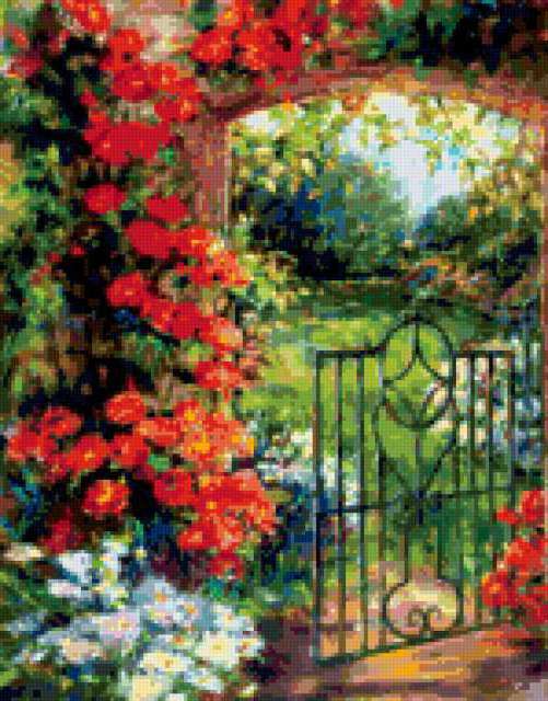 Ориентировочно так, схема вышивки «Spring Abundance», созданная автором pandreevska, будет выглядеть при отшиве на канве. Размер данной вышивки равен 149x190 крестов, при этом используется 65 цветов. Ключевые слова, по которым можно найти эту схему: garden, flowers, nature, seasons. Также, вы можете взглянуть на оригинальную картинку, соответствующую данной схеме вышивки.