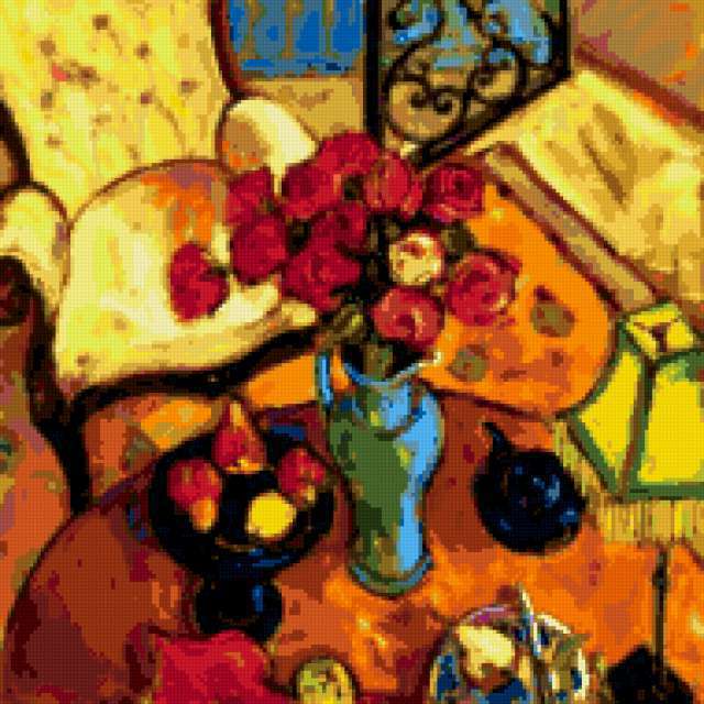 Ориентировочно так, схема вышивки «Still Life Setting in Santa...», созданная автором pandreevska, будет выглядеть при отшиве на канве. Размер данной вышивки равен 190x190 крестов, при этом используется 49 цветов. Ключевые слова, по которым можно найти эту схему: Jae Dougall, interior, flowers, colorful, bright. Также, вы можете взглянуть на оригинальную картинку, соответствующую данной схеме вышивки.