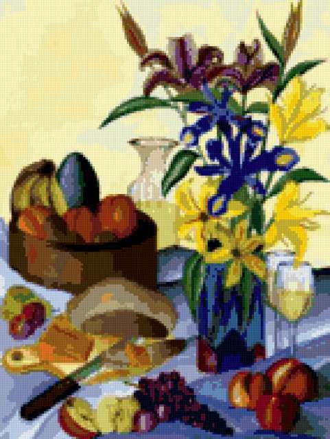 Ориентировочно так, схема вышивки «Still Life», созданная автором pandreevska, будет выглядеть при отшиве на канве. Размер данной вышивки равен 143x190 крестов, при этом используется 56 цветов. Ключевые слова, по которым можно найти эту схему: still life, натюрморт, fruits, flowers, colorful, bright. Также, вы можете взглянуть на оригинальную картинку, соответствующую данной схеме вышивки.