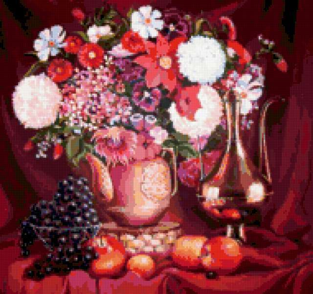 Ориентировочно так, схема вышивки «Still life», созданная автором aniela, будет выглядеть при отшиве на канве. Размер данной вышивки равен 190x179 крестов, при этом используется 74 цветов. Ключевые слова, по которым можно найти эту схему: натюрморт, цветы, flowers, naturmort, still life. Также, вы можете взглянуть на оригинальную картинку, соответствующую данной схеме вышивки.