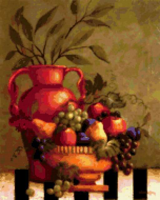 Ориентировочно так, схема вышивки «Still life», созданная автором aniela, будет выглядеть при отшиве на канве. Размер данной вышивки равен 152x190 крестов, при этом используется 64 цветов. Ключевые слова, по которым можно найти эту схему: натюрморт, naturmort, still life. Также, вы можете взглянуть на оригинальную картинку, соответствующую данной схеме вышивки.