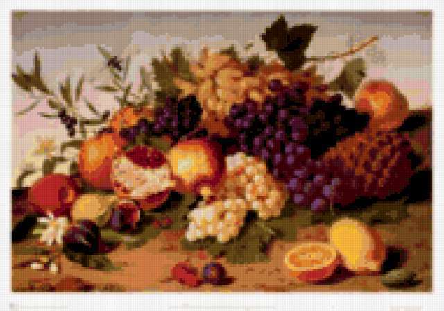Ориентировочно так, схема вышивки «Still life», созданная автором aniela, будет выглядеть при отшиве на канве. Размер данной вышивки равен 190x133 крестов, при этом используется 73 цветов. Ключевые слова, по которым можно найти эту схему: натюрморт, naturmort, still life. Также, вы можете взглянуть на оригинальную картинку, соответствующую данной схеме вышивки.