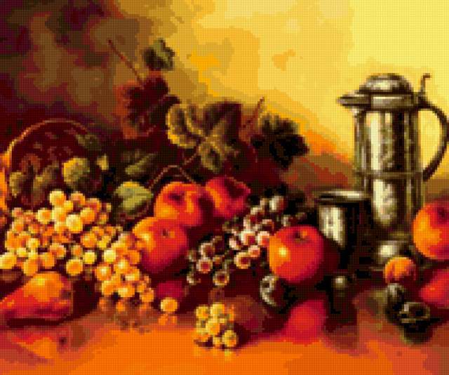 Ориентировочно так, схема вышивки «Still life», созданная автором aniela, будет выглядеть при отшиве на канве. Размер данной вышивки равен 190x159 крестов, при этом используется 61 цветов. Ключевые слова, по которым можно найти эту схему: натюрморт, naturmort, still life. Также, вы можете взглянуть на оригинальную картинку, соответствующую данной схеме вышивки.