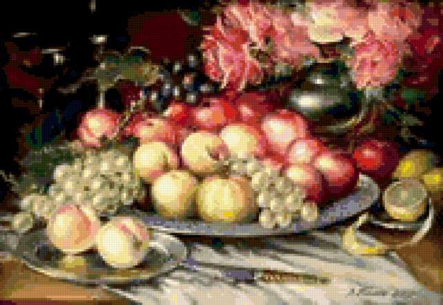 Ориентировочно так, схема вышивки «Still life», созданная автором aniela, будет выглядеть при отшиве на канве. Размер данной вышивки равен 190x131 крестов, при этом используется 84 цветов. Ключевые слова, по которым можно найти эту схему: натюрморт, naturmort, still life. Также, вы можете взглянуть на оригинальную картинку, соответствующую данной схеме вышивки.