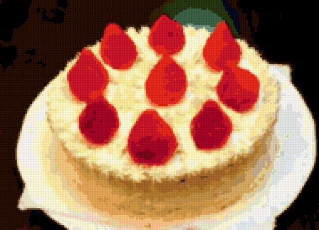 Ориентировочно так, схема вышивки «Strawberry Cake», созданная автором me4o, будет выглядеть при отшиве на канве. Размер данной вышивки равен 190x137 крестов, при этом используется 41 цветов. Ключевые слова, по которым можно найти эту схему: cake, strawberries, sweets, клубники. Также, вы можете взглянуть на оригинальную картинку, соответствующую данной схеме вышивки.