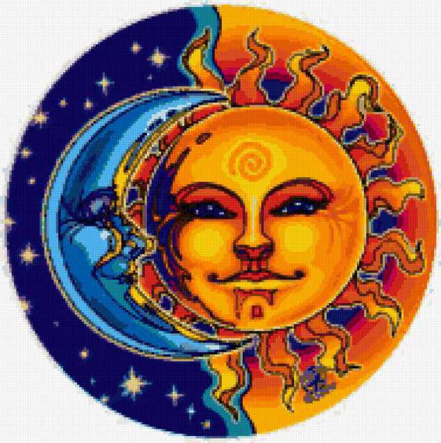 Ориентировочно так, схема вышивки «Sun and Moon», созданная автором pandreevska, будет выглядеть при отшиве на канве. Размер данной вышивки равен 189x190 крестов, при этом используется 40 цветов. Ключевые слова, по которым можно найти эту схему: abstract, fairytale, moon, sun . Также, вы можете взглянуть на оригинальную картинку, соответствующую данной схеме вышивки.
