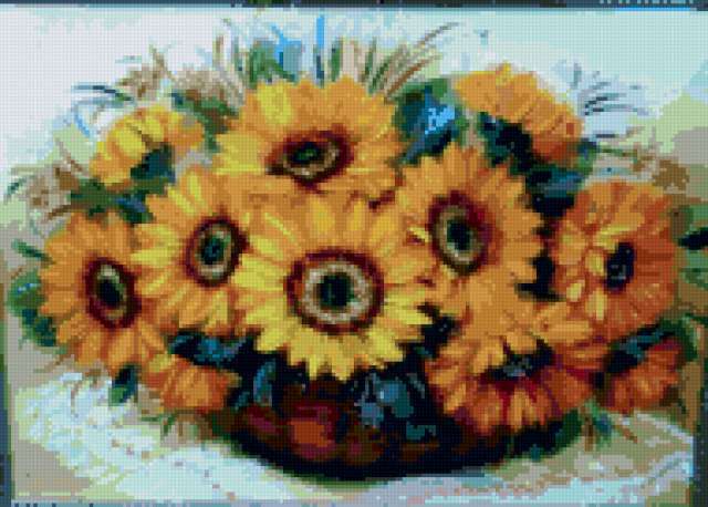 Ориентировочно так, схема вышивки «Sunflowers», созданная автором lukrecija12, будет выглядеть при отшиве на канве. Размер данной вышивки равен 190x136 крестов, при этом используется 45 цветов. Ключевые слова, по которым можно найти эту схему: flower, buket. Также, вы можете взглянуть на оригинальную картинку, соответствующую данной схеме вышивки.