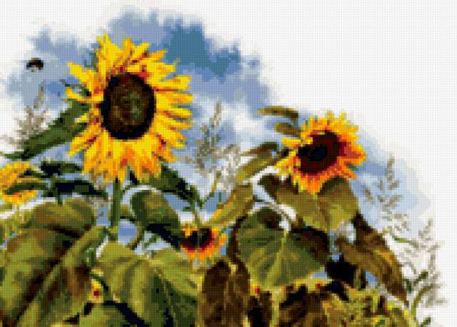 Ориентировочно так, схема вышивки «Sunflowers», созданная автором lukrecija12, будет выглядеть при отшиве на канве. Размер данной вышивки равен 190x136 крестов, при этом используется 58 цветов. Ключевые слова, по которым можно найти эту схему: cvety, flower. Также, вы можете взглянуть на оригинальную картинку, соответствующую данной схеме вышивки.