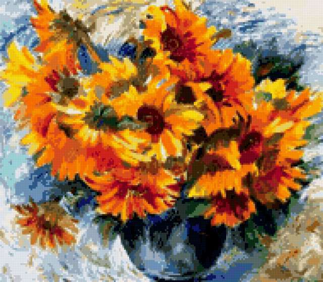 Ориентировочно так, схема вышивки «Sunflowers», созданная автором pandreevska, будет выглядеть при отшиве на канве. Размер данной вышивки равен 190x166 крестов, при этом используется 58 цветов. Ключевые слова, по которым можно найти эту схему: цветок, букет, ваза, натюрморт, sunflowers. Также, вы можете взглянуть на оригинальную картинку, соответствующую данной схеме вышивки.