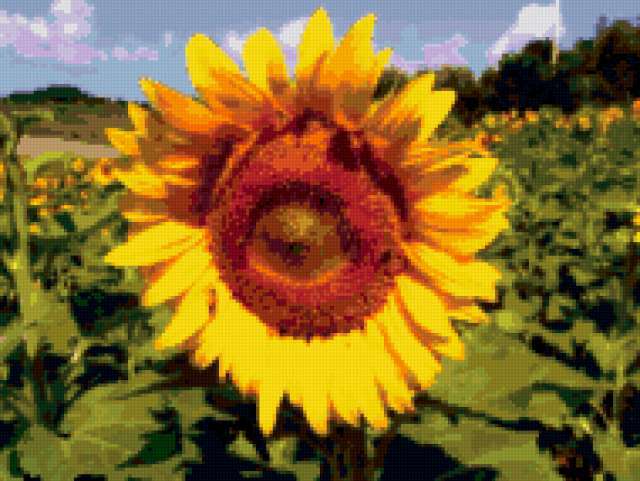 Ориентировочно так, схема вышивки «Sunflowers...», созданная автором nastiusha, будет выглядеть при отшиве на канве. Размер данной вышивки равен 190x143 крестов, при этом используется 62 цветов. К несчастью, автор не назначил для схемы ключевые слова. Также, вы можете взглянуть на оригинальную картинку, соответствующую данной схеме вышивки.