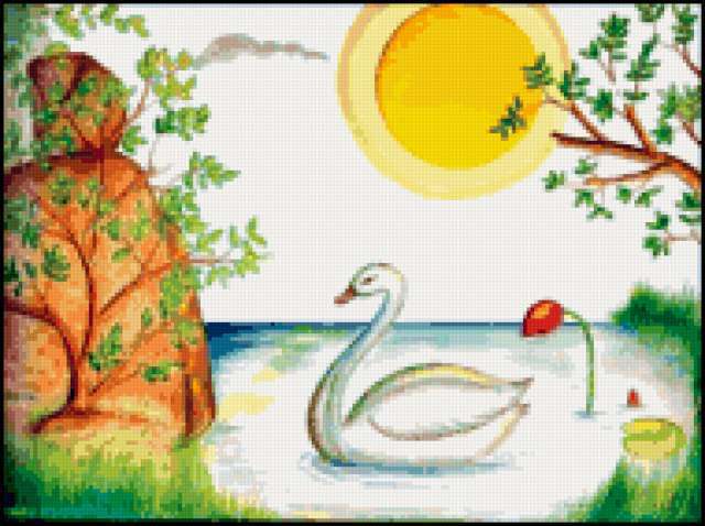 Ориентировочно так, схема вышивки «Swan», созданная автором aniela, будет выглядеть при отшиве на канве. Размер данной вышивки равен 190x142 крестов, при этом используется 85 цветов. Ключевые слова, по которым можно найти эту схему: wildlife, birds, птицы. Также, вы можете взглянуть на оригинальную картинку, соответствующую данной схеме вышивки.