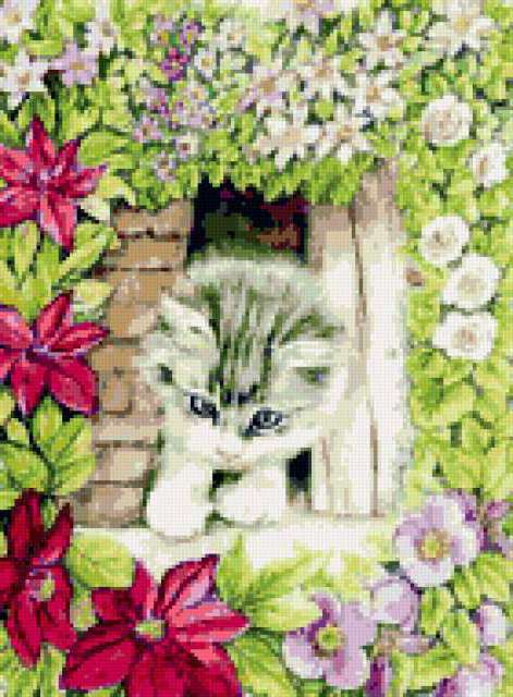 Ориентировочно так, схема вышивки «Sweet Kitty», созданная автором pandreevska, будет выглядеть при отшиве на канве. Размер данной вышивки равен 140x190 крестов, при этом используется 54 цветов. Ключевые слова, по которым можно найти эту схему: animals, животные, kitty, sweet, cute, flowers. Также, вы можете взглянуть на оригинальную картинку, соответствующую данной схеме вышивки.