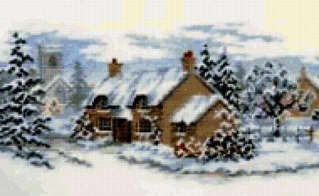 Ориентировочно так, схема вышивки «Talv», созданная автором aniela, будет выглядеть при отшиве на канве. Размер данной вышивки равен 190x117 крестов, при этом используется 70 цветов. Ключевые слова, по которым можно найти эту схему: cottage, пейзаж, архитэктура, домики, winter. Также, вы можете взглянуть на оригинальную картинку, соответствующую данной схеме вышивки.