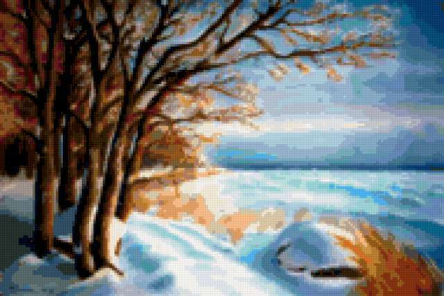 Ориентировочно так, схема вышивки «Talv», созданная автором aniela, будет выглядеть при отшиве на канве. Размер данной вышивки равен 190x127 крестов, при этом используется 78 цветов. Ключевые слова, по которым можно найти эту схему: winter, пейзаж, landscape, зима. Также, вы можете взглянуть на оригинальную картинку, соответствующую данной схеме вышивки.