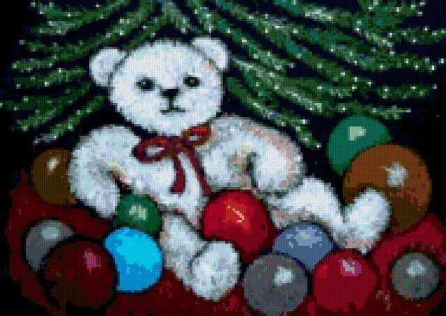 Ориентировочно так, схема вышивки «Teddy Bear», созданная автором pandreevska, будет выглядеть при отшиве на канве. Размер данной вышивки равен 190x135 крестов, при этом используется 54 цветов. Ключевые слова, по которым можно найти эту схему: animals, животные, magic, bear, teddy. Также, вы можете взглянуть на оригинальную картинку, соответствующую данной схеме вышивки.