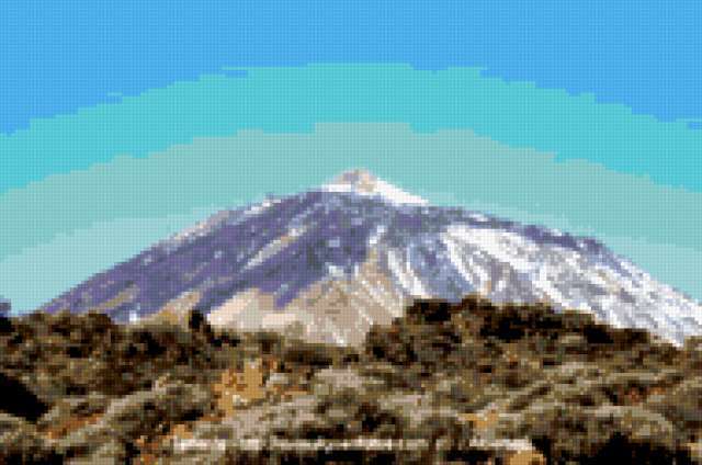 Ориентировочно так, схема вышивки «Teide4», созданная автором ainara, будет выглядеть при отшиве на канве. Размер данной вышивки равен 190x126 крестов, при этом используется 39 цветов. Ключевые слова, по которым можно найти эту схему: montaсas. Также, вы можете взглянуть на оригинальную картинку, соответствующую данной схеме вышивки.