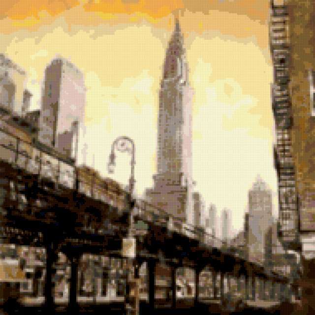 Ориентировочно так, схема вышивки «The Chrysler Building», созданная автором pandreevska, будет выглядеть при отшиве на канве. Размер данной вышивки равен 190x190 крестов, при этом используется 44 цветов. Ключевые слова, по которым можно найти эту схему: Cityscape, New York, Famous Places. Также, вы можете взглянуть на оригинальную картинку, соответствующую данной схеме вышивки.