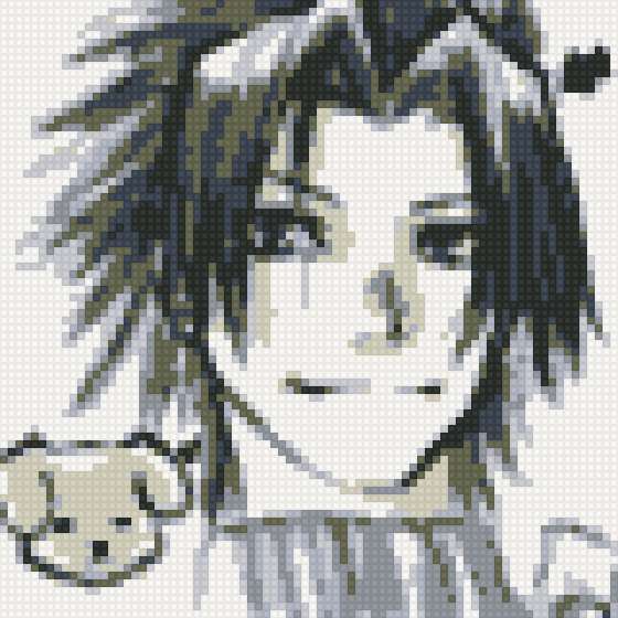 Ориентировочно так, схема вышивки «The Puppy», созданная автором EmAerith, будет выглядеть при отшиве на канве. Размер данной вышивки равен 80x80 крестов, при этом используется 8 цветов. Ключевые слова, по которым можно найти эту схему: final fantasy, zack fair, зак. Также, вы можете взглянуть на оригинальную картинку, соответствующую данной схеме вышивки.
